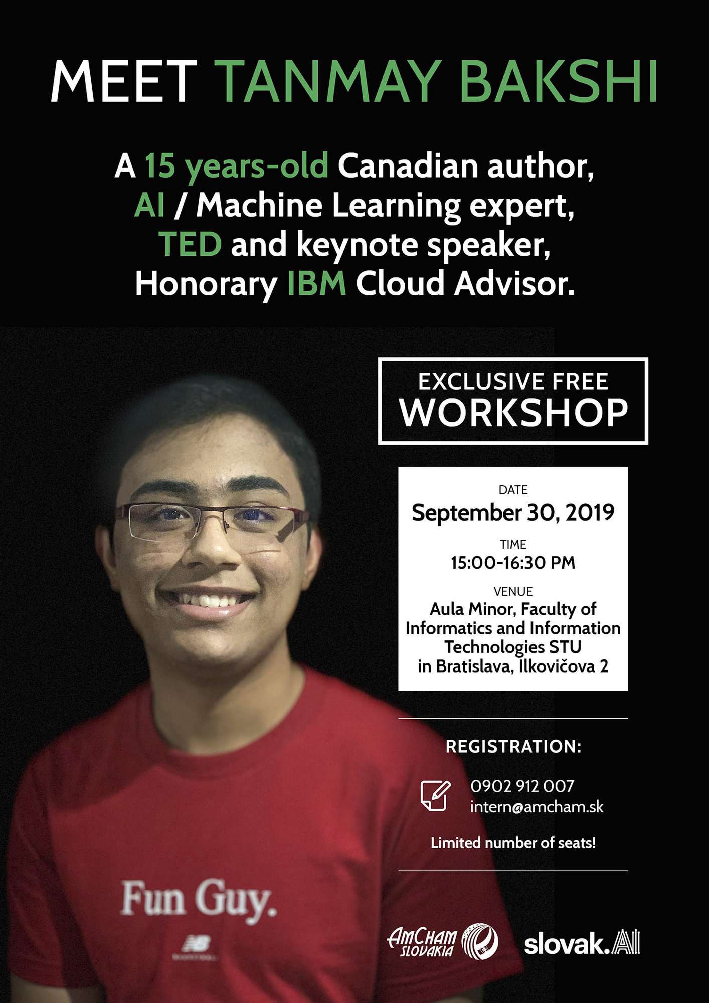 Pozvývame vás na workshop s 15 ročným IT expertom Tanmayom Bakshim, ktorý sa uskutoční v pondelok 30.9.2019 15:00 - 16:30 hod. v budove FIIT STU na Ilkovičovej 2.